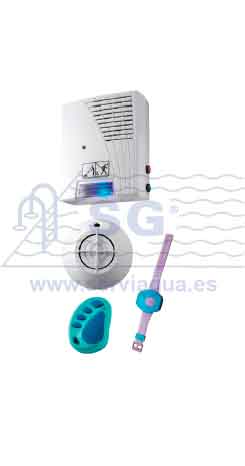 El suministro se completa con una unidad de brazalete independiente de los captadores sonar que se activa por contacto con el agua. Este brazalete activaría la alarma en contacto con el agua independientemente al sistema sonar.