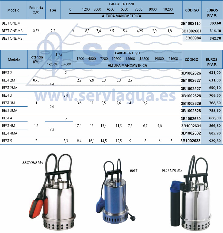 Modelo BEST ONE con cierre mecánico Cerámica/Carbón/NBR, modelo BEST doble cierre mecánico en camara de aceite, superior Carbón/Cerámica/NBR e inferior Sic/Sic/NBR. Modelos terminados en M con motor monofásico a 230v. Modelos terminados en MA con interruptor automático de nivel tipo boya, terminados en MS con regulador magnético de nivel. Resto trifásicos a 400V.