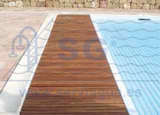 Las tapas de alejamiento protege el cajón en donde va alojada la cubierta. Apoya por una parte en el borde de la piscina y por otra parte en la vigueta (perfil soporte). Dos acabados disponibles: En madera de Iroko o aluminio blanco.