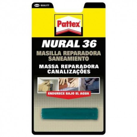 Pattex Nural 36 pega, rellena, reconstruye y sella (grietas, agujeros, fisuras y uniones) de forma permanente. Una vez endurecido puede ser lijado, pulido, mecanizado, taladrado y pintado.