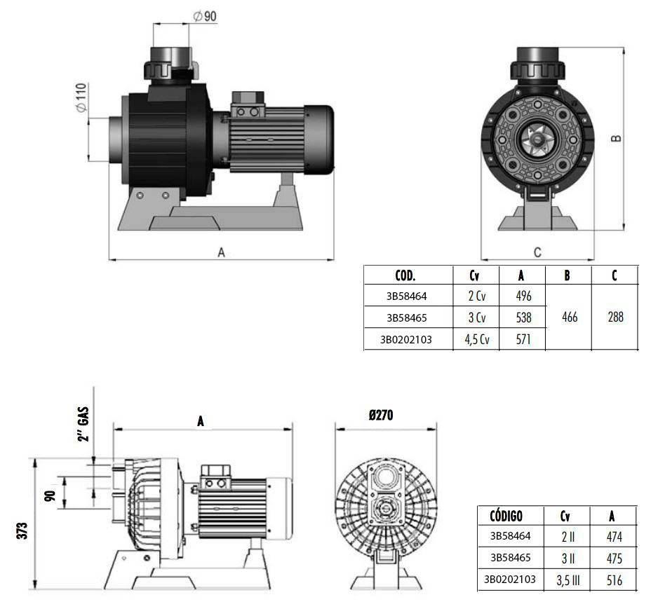 Bomba para natación contracorriente con elevadas prestaciones de presión y caudal. Mayor diámetro de las conexiones de aspiración e impulsión de la bomba paraaumentar las prestaciones de caudal requeridas en este tipo de equipos.