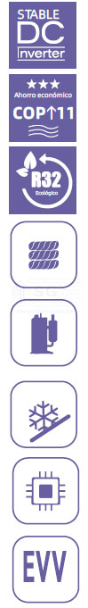 - Su compresor DC Inverter es hasta un 20% más eficiente que las de la misma categoría del mercado, y su intercambiador de calor de espiral es un 40% más eficiente que los tradicionales.