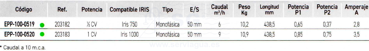 - Se suministra con racores de aspiración e impulsión para encolar Ø50 mm.