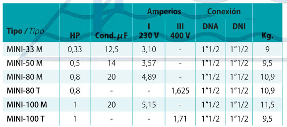 - Motor cerrado con protección IP 44 a 2800 r.p.m. (Los monofásicos tienen un protector térmico).