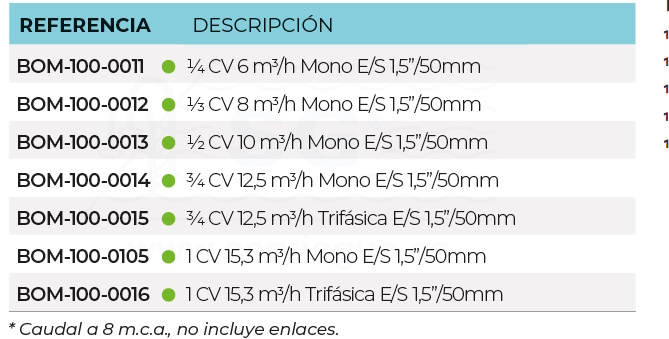 REFERENCIA | POTENCIA | CORRIENTE | CAUDAL | CONEXIONES E / S |