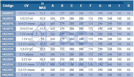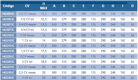 Electrobomba centrífuga autoaspirante con prefiltro incorporado. Simple, robusta y compacta. La familia HGS está disponible desde 1/2 CV hasta 3 CV tanto en motores monofásicos(230V) como trifásicos (230/400V) permitiendo una variación de ± 10% respecto a la tensión nominal debido a que incorporan motores eurotensión. Cuerpo monobloque fabricado con materiales composites inalterables. Turbina de Noryl y sello mecánico inoxidable AISI-316. Tapa traslúcida de apertura rápida. Motor protección IP55, Clase 155. Servicio continuo (protector térmico incorporado). Temperatura máxima del agua 35-40°C.