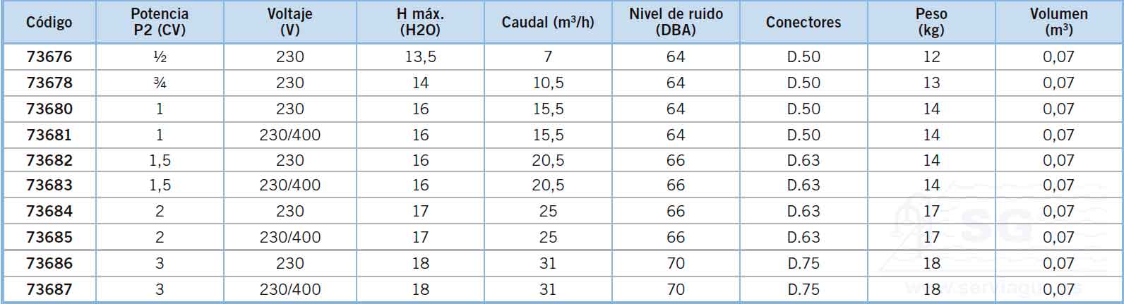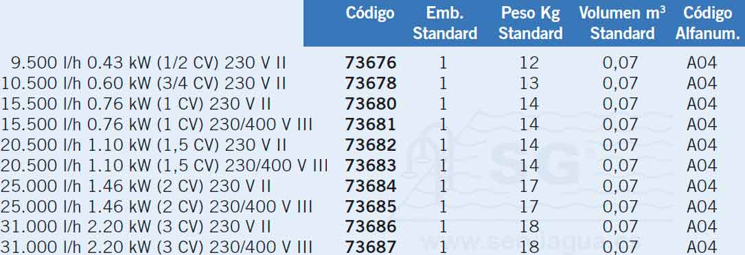 Caudales en l/h a 8 m.c.a. para 0,5 CV y a 10 m.c.a. para el resto.
