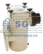 Prefiltros serie PK, fabricados en termoplástico inyectado, tapa de policarbonato transparente, con cierre de la tapa mediante cuatro palomillas abatibles con espárragos en acero Inox y cestillo en material plástico inyectado.