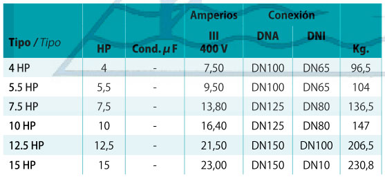 - Características: Bombas para trasiego y prefiltrado de grandes caudales de agua a poca presión, aspiración máxima 2 metros.