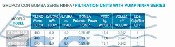 Grupos de filtración compuestos por: Filtro serie GRANADA, válvula selectora TOP 6 vias, manómetro, bomba serie NINFA o ONDINA, bancada de componentes polímeros y kit de unión. Velocidad de filtración: 50 m 3/ h / m 2 .