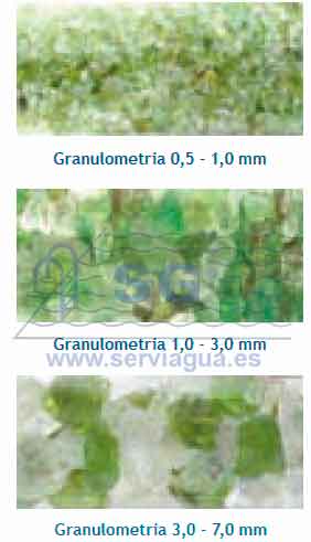 Medio filtrante respetuoso con el medio ambiente fabricado con vidrio reciclado. Se dispone de diferentes granulometrías