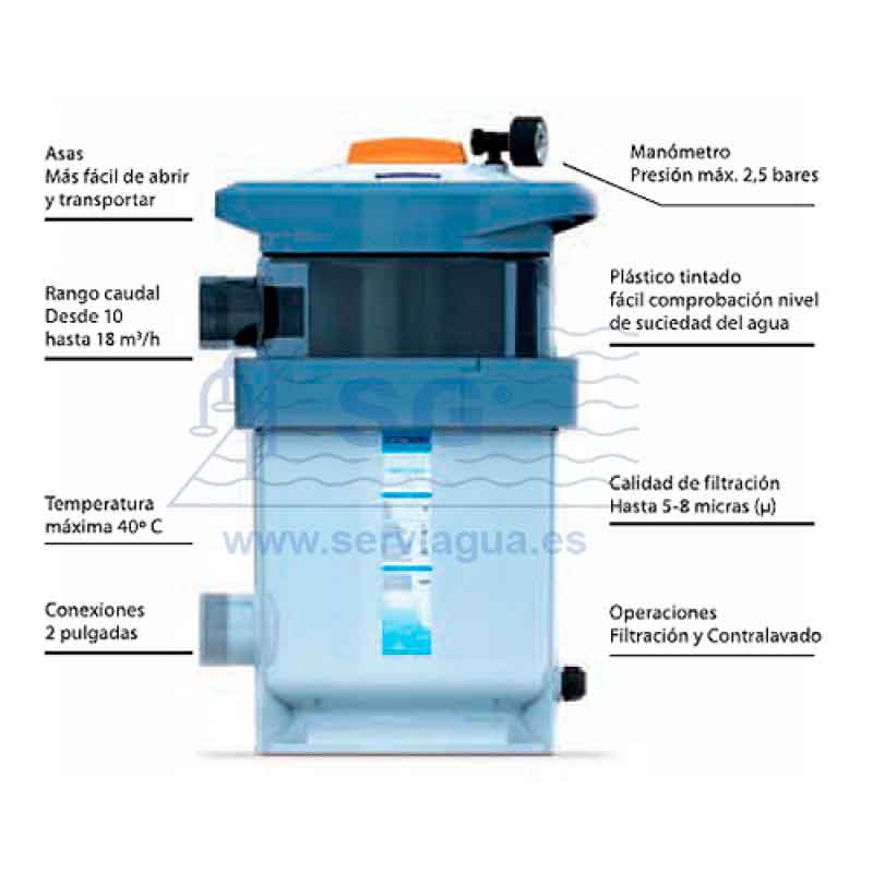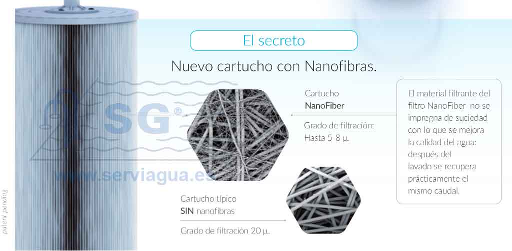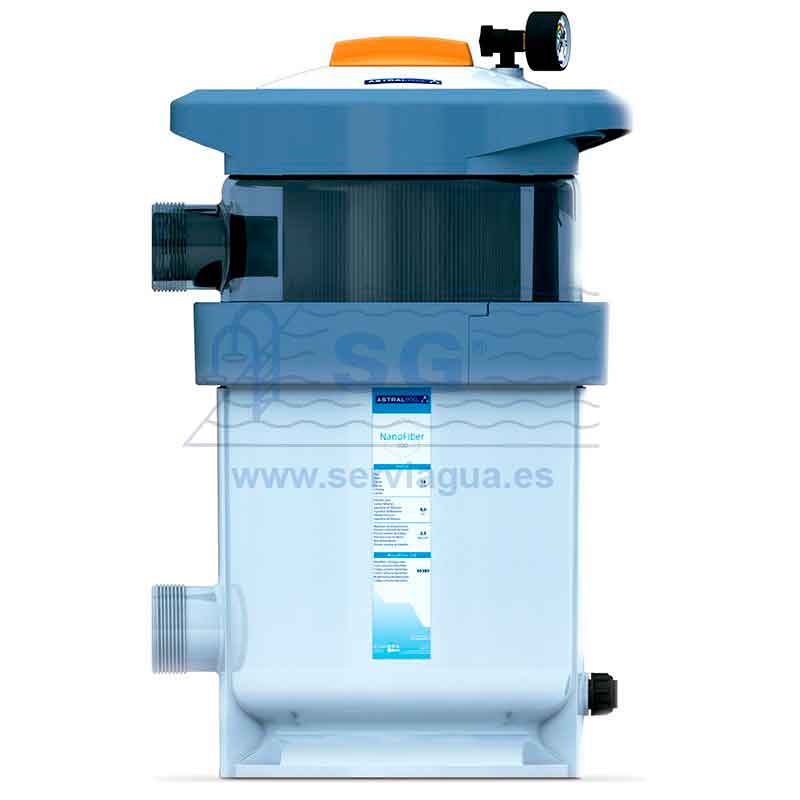 Filtro para piscinas residenciales, hasta 90 m3, que se caracteriza por su alta calidad de filtración: 5-8 micras, su función de autolimpiable y por sus reducidas dimensiones. El filtro NanoFiber utiliza un innovador material filtrante que ofrece una mayor calidad de filtración debido a su red
