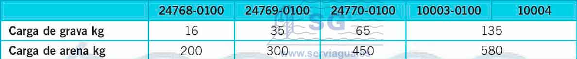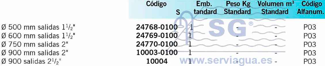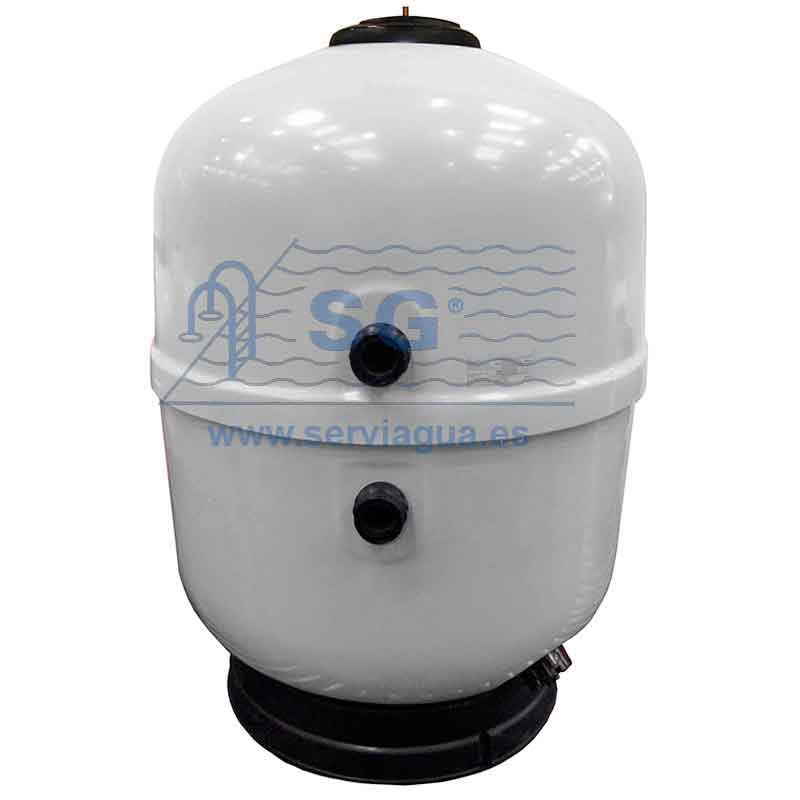 Filtro laminado en poliéster y fibra de vidrio. Altura lecho filtrante 800 mm. Color gris, pie en polipropileno, nueva tapa sin tornillos, tapón para vaciado de agua. Presión máxima de trabajo 2,5 kg/cm2 . Velocidad máx. de filtración 50 m3/h/m2. El filtro se puede usar en monocapa o multicapa combinando grava con arena, vidrio o antracita. Tapa superior de apertura ráp ida. Descarga de arena de 21/ 2" en la parte inferior del filtro. Descarga de arena opciona la de d.200mm. Opcionalmente con acabado interior de vinilester para tratamientos conozono. Temperatura máxima de trabajo de 40º.