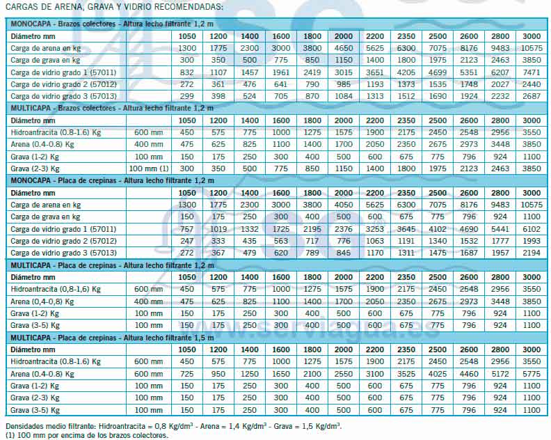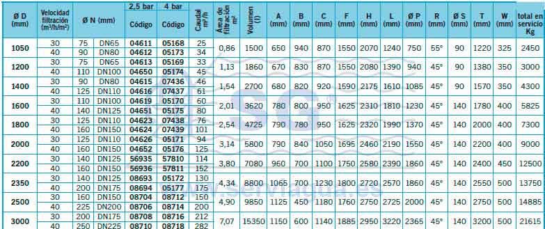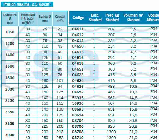 Diámetro (mm) | Velocidad filtración m3 / h / m2 | Salida mm. | Caudal m3 / h | Código |