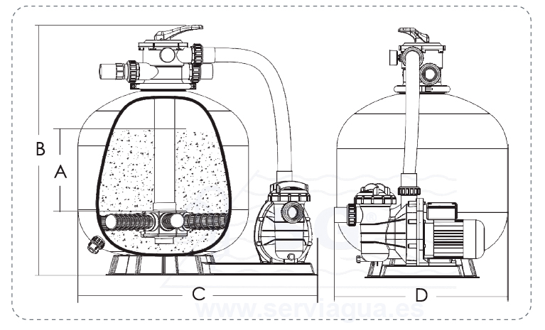 - Gran versatilidad: incluye conjunto de bomba, filtro de arena y válvula selectora de 6 vías, perfectamente montado sobre una base de soporte en plástico de alta resistencia.