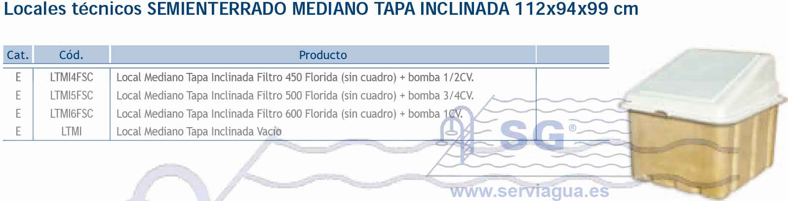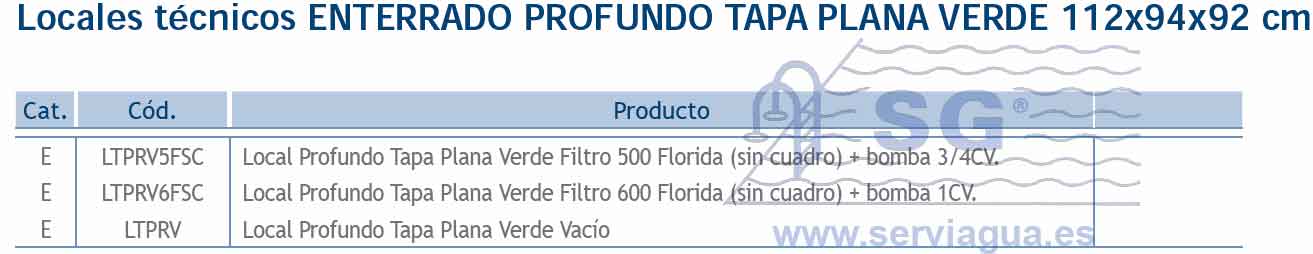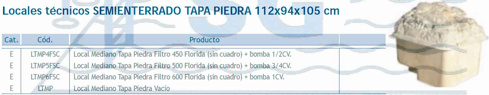 Todos los locales técnicos, están fabricados en poliéster armado con fibra de vidrio y equipados con bisagras de acero inoxidable AISI316 para evitar su corrosión, y barras soporte de la tapa. Los modelos de partida siempre irán con filtro Florida (laminado) y bomba Lyon. Los locales incluyen una preinstalación de tubos de aspiración para skimmer, fondo y limpiafondos, impulsión por boquillas y desagüe para el vaciado y lavado de filtro, batería de 3 válvulas de bola. Los locales vacíos se suministran sin agujeros, desmontados y con 5 pasatubos de 50, bisagras, tornillería, soportes de tapa y tapa. Se aconseja estudiar previamente las necesidades y ubicación del local técnico para que su funcionalidad sea óptima y se adapte a la perfección a las necesidades y características de la piscina. Respecto a todos los modelos grandes, se deben utilizar siempre que se añada un opcional a una depuración estándar (bomba extra y/o equipos de tratamiento de agua). Consúltenos las combinaciones posibles.