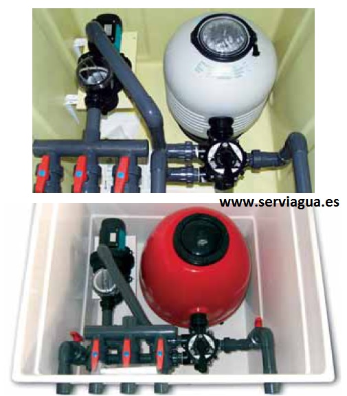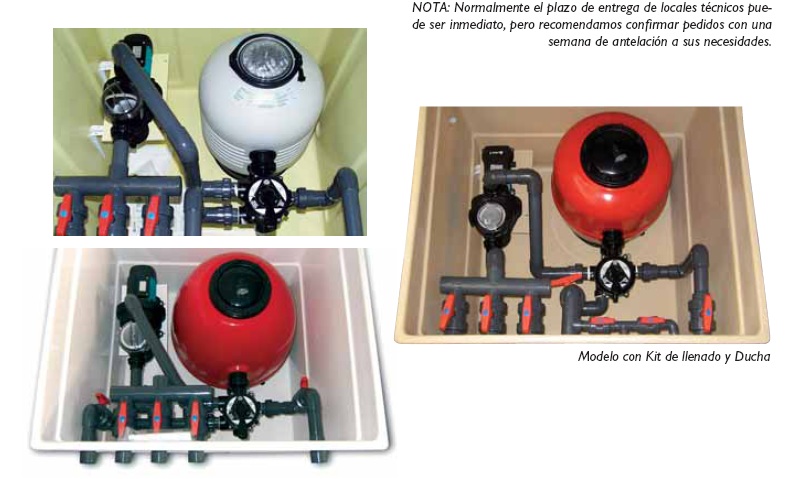 Incluyen filtro con válvula de 6 posiciones, bomba con prefiltro monofásica, colector, accesorios y válvulas PVC Ø 50, no incluyendo cuadro eléctrico.