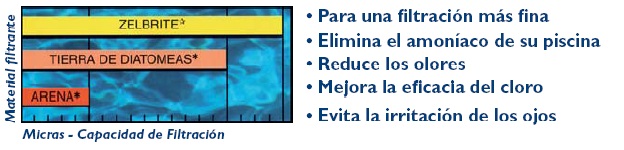 Material filtrante de alto rendimiento a base de zeolitas purificadas y clasificadas para su uso en piscinas. Su estructura porosa aporta una gran superficie que atrap partículas de hasta una micra, por lo que retiene más partículas que la arena o las diatomeas.