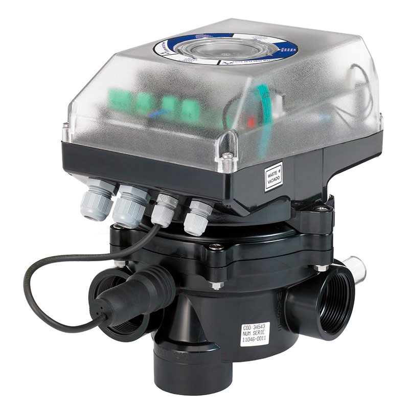 Válvula selectora automática mejorada provista de teclado con pulsadores para las maniobras. Hace posible controlar las posiciones de filtración, lavado, enjuague, vaciado, circulación y cierre.