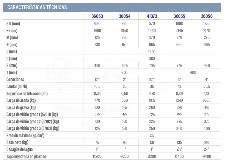 Gama de filtros de alta capacidad de retención y con un óptimo rendimiento de lavado. Fabricados en poliéster y acabado externo en gel-coat. Cuerpo de sólo dos partes, color del filtro marfil. Temperatura máxima de trabajo 50 ºC. Componentes internos hechos de plástico PVC. Tapa para extraer arena situada en la parte inferior del filtro (opcional) de Ø 400 en filtros de Ø 1050 y 1200. Filtros de Ø 650, 800, 950, 1050 y 1200 mm disponibles con brazos colectores o con placa de crepinas. Compatibles con arena y vidrio entre otros Cumple con las exigencias de la normativa de filtración EN 16713-1.