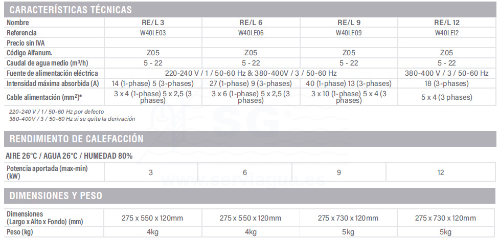 • RE / L3, 6 y 9: monofásico simplificado 230V -50 / 60Hz / trifásico Potencia 400V-50 / 60Hz (230V trifásico bajo pedido)
