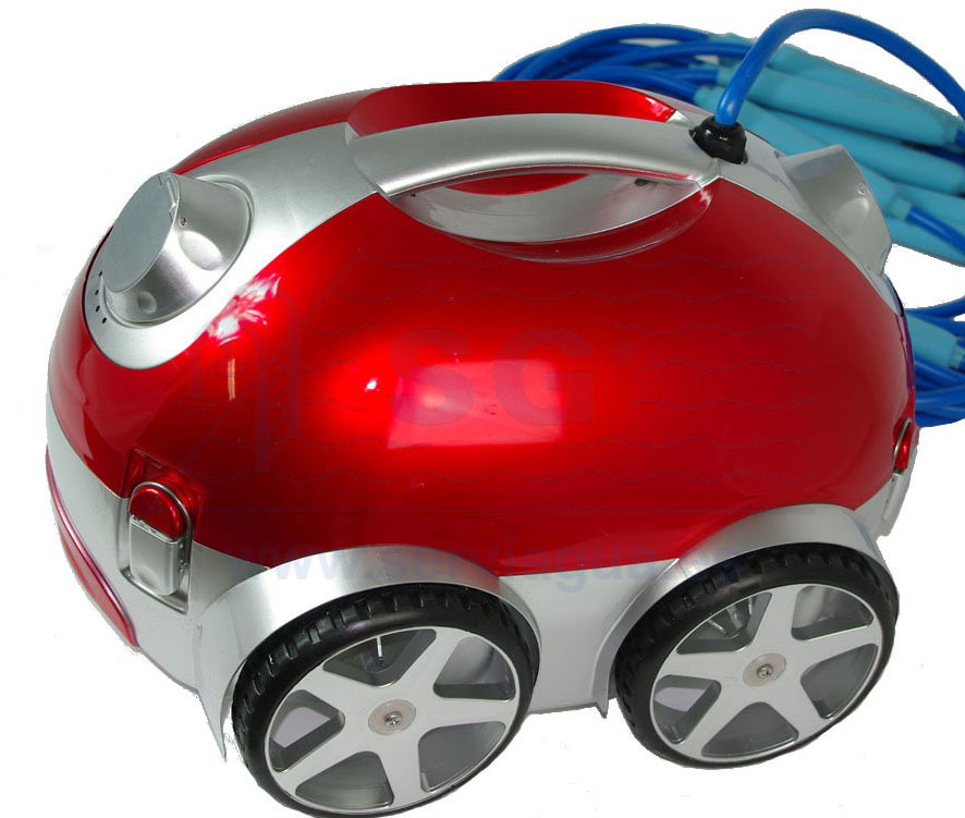 Robot sencillo y económico que utiliza un sistema de desplazamiento por propulsión a chorro de agua, ideal para pequeñas piscinas de fondo plano.