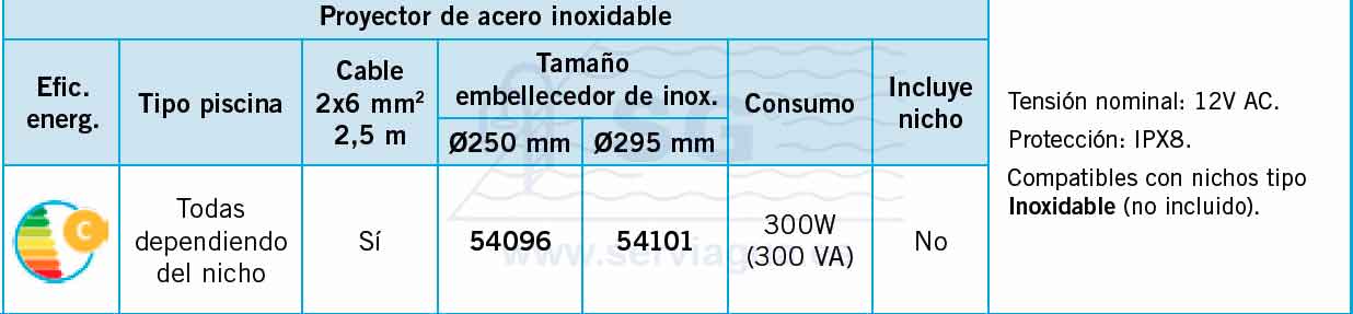 Proyectores para su instación en nicho Inoxidable (no incluido). Para completar la instalación se debe adquirir el nicho adecuado a cada piscina.