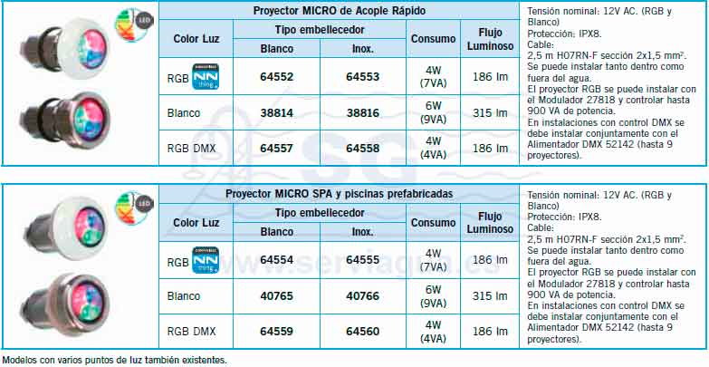 Nota: Recomendaciones válidas para piscinas con colores claros y para proyectores con luz blanca, sobredimensionar en colores RGB. En piscinas