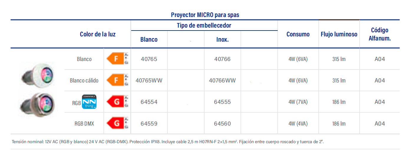 Los proyectores se pueden instalar dentro y fuera del agua. El modelo RGB es compatible con los sistemas de control LumiPlus ECO, LumiPlus Top, aplicación LumiPlus LED y LumiPlus Modbus. El modelo RGB DMX requiere el alimentador LumiPlus DMX 52142.