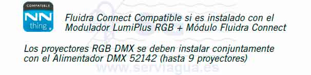 El modelo RGB DMX necesita el controlador Alimentador Lumiplus DMX 52142 (ver página 283). El proyector RGB se puede instalar con el modulador 27818 y controlar hasta 900 VA de potencia.