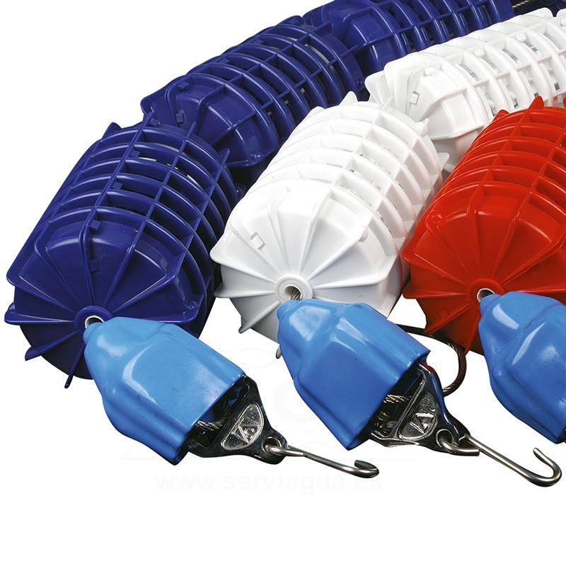 Las corcheras se suministran montadas con flotadores, cable de acero inox de 6 mm, tensor (00208) y amortiguador (01468). Flotadores con turbinas interiores, con diámetro interior de 18 mm conforme con reglamento de la Federación Internacional de Natación (FINA)