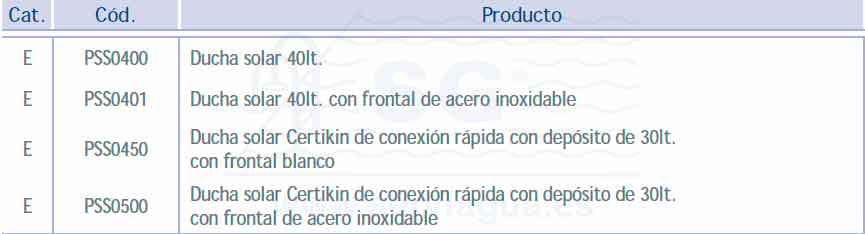 Ducha solar fabricada con depósito de polipropileno color negro de 30 litros de capacidad, con aleación de alu-minio, magnesio y resinas con partículas metálicas, con 2 grifos para regulación de temperatura mediante agua fría y agua caliente. Según su orientación al sol puede alcanzarse temperaturas superiores a los 60º.