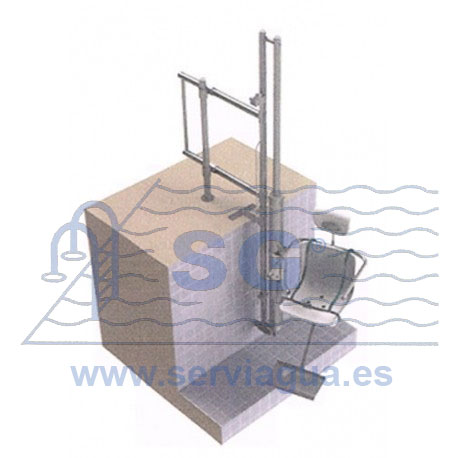 Elevador portátil hidráulico para el fácil acceso de discapacitados físicos a la piscina. Compuesto por pistón hidráulico, fabricado en acero inoxidable aiSi316, de 48mm y 2mm de grosor (funcionamiento a más de 3 kg y menos de 5 kg de presión de agua de la red), silla de PVC, barra de anclajes con apoyos, anclaje de acero inoxidable con tapeta extraíble y mando de accionamiento para monitor de apertura y cierre desde el exterior o interior de la piscina indistintamente. es fácilmente transportable lo que permite instalar diversos anclajes, utilizando un solo elevador.