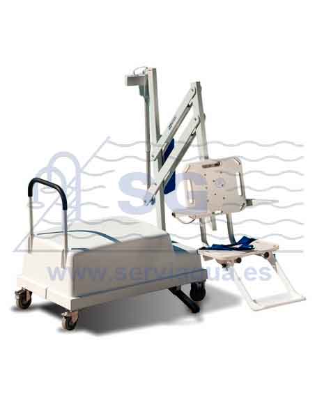 Silla portátil para minusválidos. No requiere de ningún tipo de montaje en la playa de la piscina. Su batería recargable de 24 V alimenta un actuador mecánico, asegurando que el equipo siempre esté listo para su uso. Duración 30 ciclos una vez cargada. Es la solución perfecta para instalaciones con varias piscinas ya que se puede colocar en cualquier lugar de la playa de la piscina y guardarla cuando se necesite. Mando de control resistente al agua. Fácil de utilizar incluso para el usuario final, se acerca la silla al borde de la piscina, se bloquean las ruedas, se pone el estabilizador y la silla esta lista para usarse. Estructura de materiales resistentes al agua para evitar la corrosión. Reposa brazos y reposa pies incluidos. La Pal se convierte en accesible a cualquier piscina en segundos. Es realmente el modo más sencillo para que un minusválido acceda a la piscina. Silla PAL II.