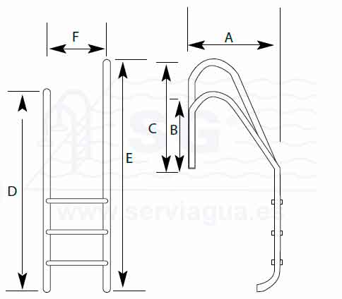 - Escalera estándar en acero inoxidable de 43 x 1,2 mm. con anclajes y tapetas.