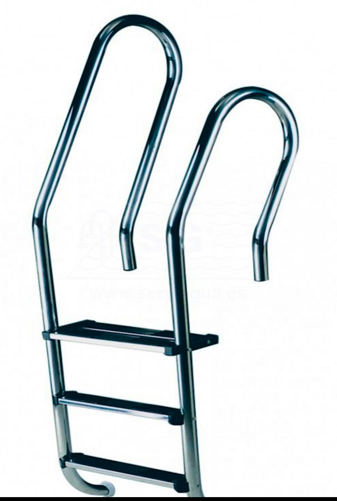 Escaleras con pasamanos modelo Mixto, para piscinas enterradas, fabricadas en tubo Ø 43 mm de acero inoxidable acabado pulido brillante. Su cuidado diseño garantiza seguridad contra todo tipo de deslizamientos cortes. Suministradas con anclajes de fijación, previstos para conexión a toma equipotencial. Pasamanos y peldaños LUXE en AISI-316L.