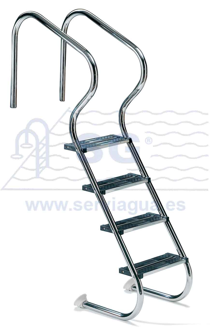 Ancho escalera 500 mm. Pasamanos de Ø 43 mm y peldaños inox de seguridad con doble superficie antideslizante. Acabado pulido brillante. Con anclajes de fijación previstos para conexión al circuito equipotencial. Peldaños y pasamanos en acero inox AISI-316. Cumple con norma EN 13451-1 y En 13451-2