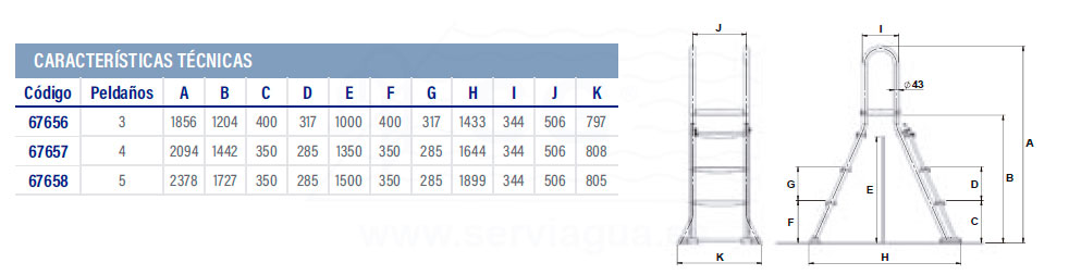 Escalera fabricada en tubo Ø43 de acero inoxidable AISI-304L acabado pulido brillante y peldaños de plástico.