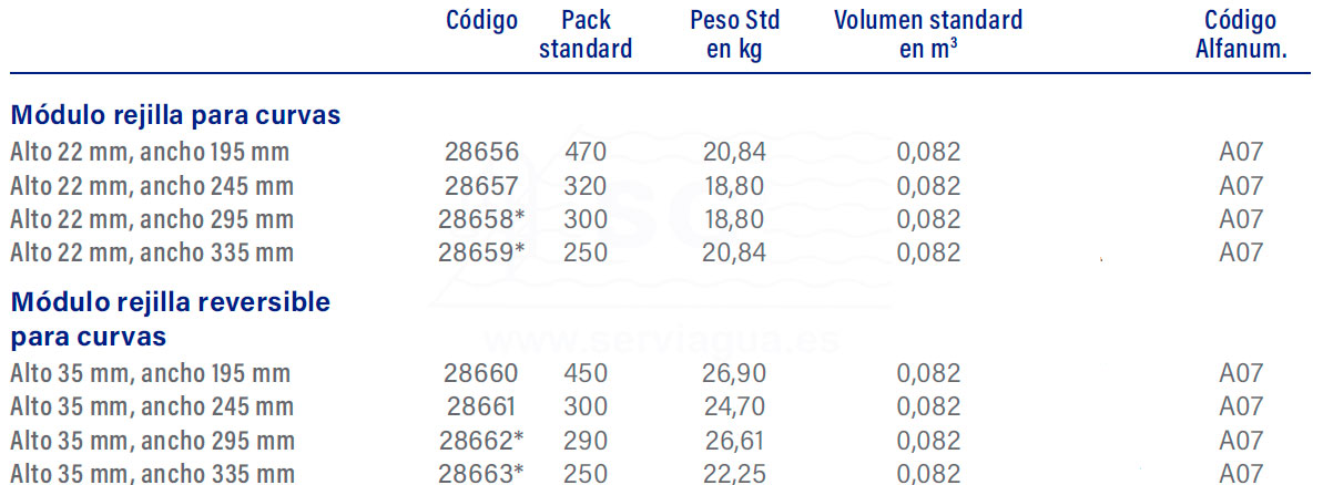 módulo rejilla para curvas Alto 22 mm, ancho 195 mm