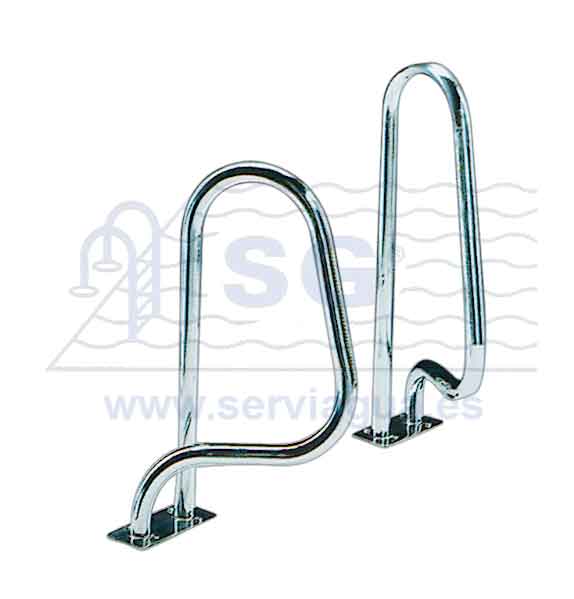 Juego de 2 pasamanos en tubo Ø 43 mm de acero inox AISI-316 pulido brillante. Las salidas de piscina con pletinas se suministran con tacos anclaje y tornillos.