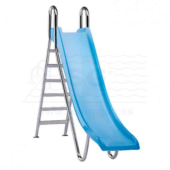 Pista en poliéster y FV color azul claro. Peldaños en material plástico. Barandillas de inoxidable pulido. Equipado con toma de agua para facilitar el deslizamiento Se suministra con anclajes.