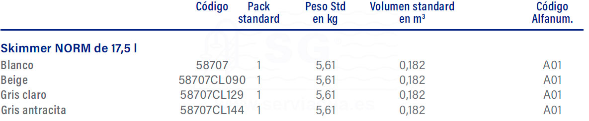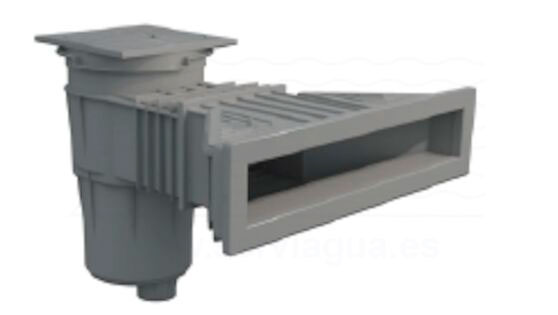 Gama de skimmers de 17 l aptos para instalarse en piscinas públicas y privadas. Fabricados en ABS con tratamiento UV, incorporan compuerta, regulador de caudal, regulador en altura de la tapa y cesto. La entrada del agua es de 495 × 80 mm. Caudal recomendado 7,5 m3/h. Instalar un skimmer cada 25 m2 de superficie de lámina de agua. Conexiones inferiores de 1"1/2 y de 2", conexión superior de agua sobrante de Ø 40 mm.