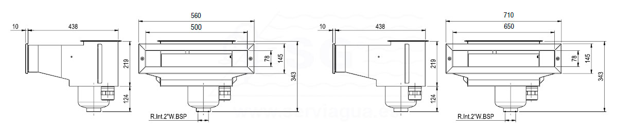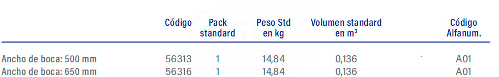 En acero inoxidable AISI-316L. Con rebosadero Ø50 mm, cesta y tapa de acero inoxidable, ambas incluidas. Dispone de alojamiento para montar válvula reguladora. Con conexión para toma equipotencial. Flujo recomendado: 7,5 m3/h. incluyen bridas para piscinas prefabricadas. También está disponible con inclinación de 6°: Nivel de gua +/- 8 cm. Capacidad del cesto: 1,2 l.