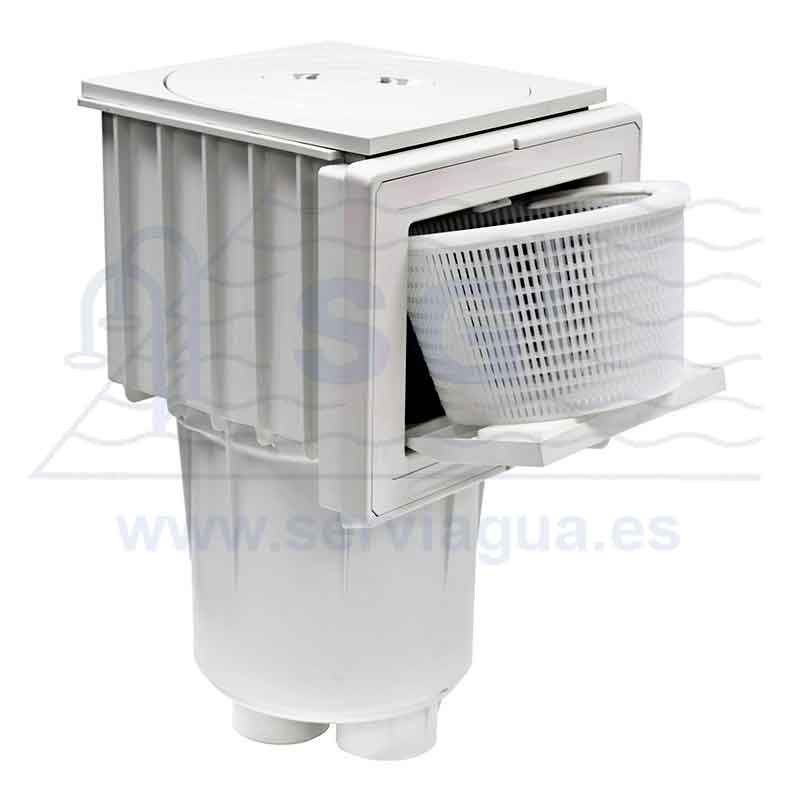 Nueva gama de skimmers de 17L aptos para instalarse en piscinas residenciales. Gracias a su poca longitud, 250mm. son ideales para instalarse en piscinas construidas en bloques de poliestireno expandido, además gracias a su configuración llevan el nivel del agua al borde de la piedra de coronación. Fabricados en ABS blanco con tratamiento UV incorpora compuerta, regulador de caudal y cesto de recogehojas. Caudal recomendado 7,5m³/h y instalar un skimmer cada 25 m² de superficie de lámina de agua. Conexiones inferiores de Ø 63mm. y de 2", conexión de agua sobrante de Ø 32 mm.