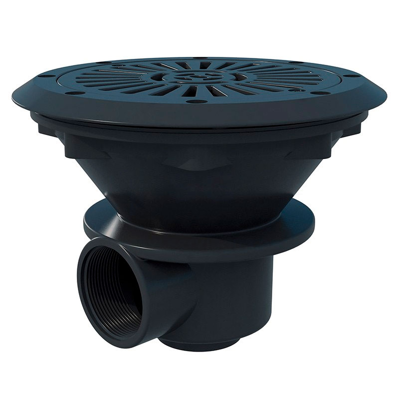 Salida lateral de 2”. Cuerpo y rejilla en ABS blanco, con juntas adhesivas, brida y tornillos. Caudal máximo recomendado de 13 m3/h.