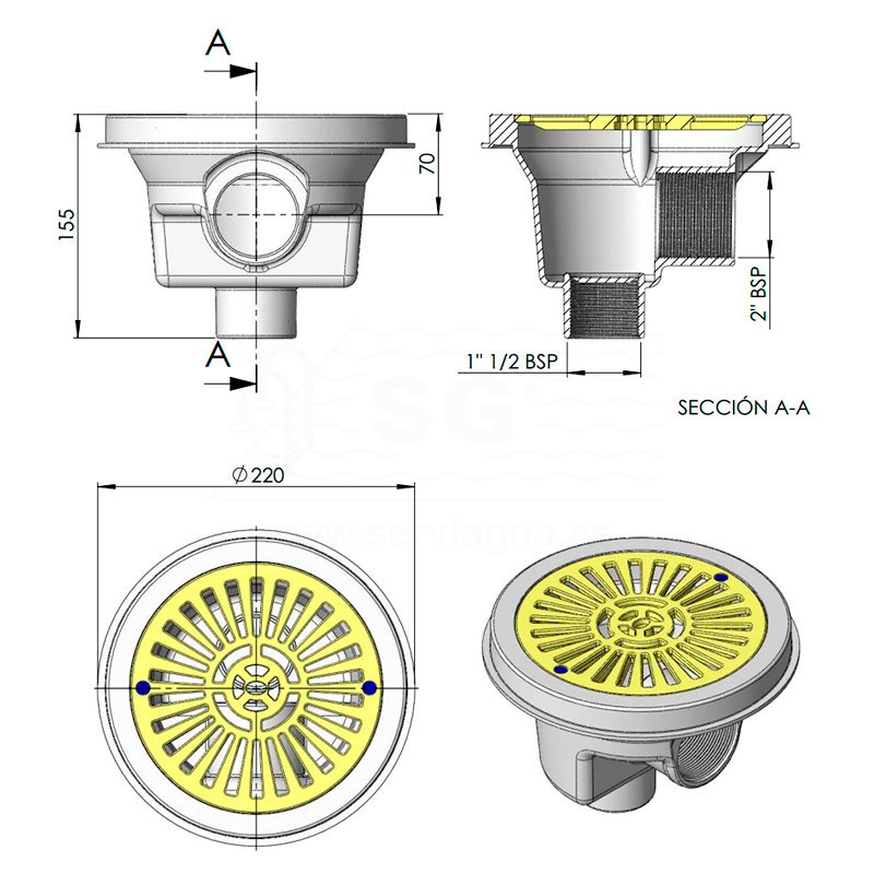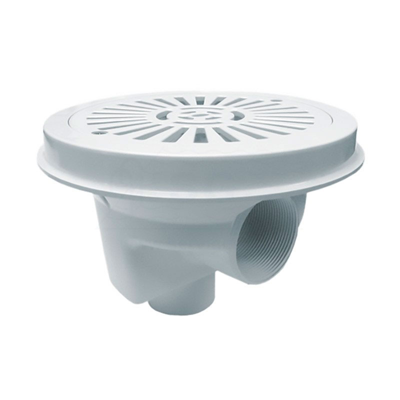 Fabricado en ABS blanco. Salida lateral de 2” y salida inferior de 1½”. Salida inferior tapada con un