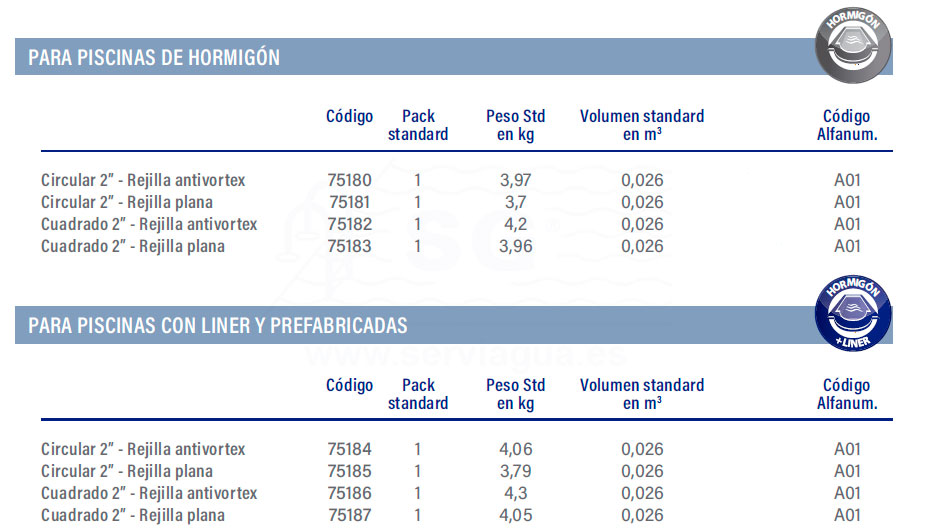 Gama de sumideros fabricados en acero inoxidable AISI-316L, equipados con una conexión de salida lateral de 2". Toda la gama comparte el mismo cuerpo, con diferentes opciones de rejilla (plana o antivortex y circular o cuadrada). Para piscinas con liner, viene con juntas y tornillos. Caudal máximo: 13 m³/h.