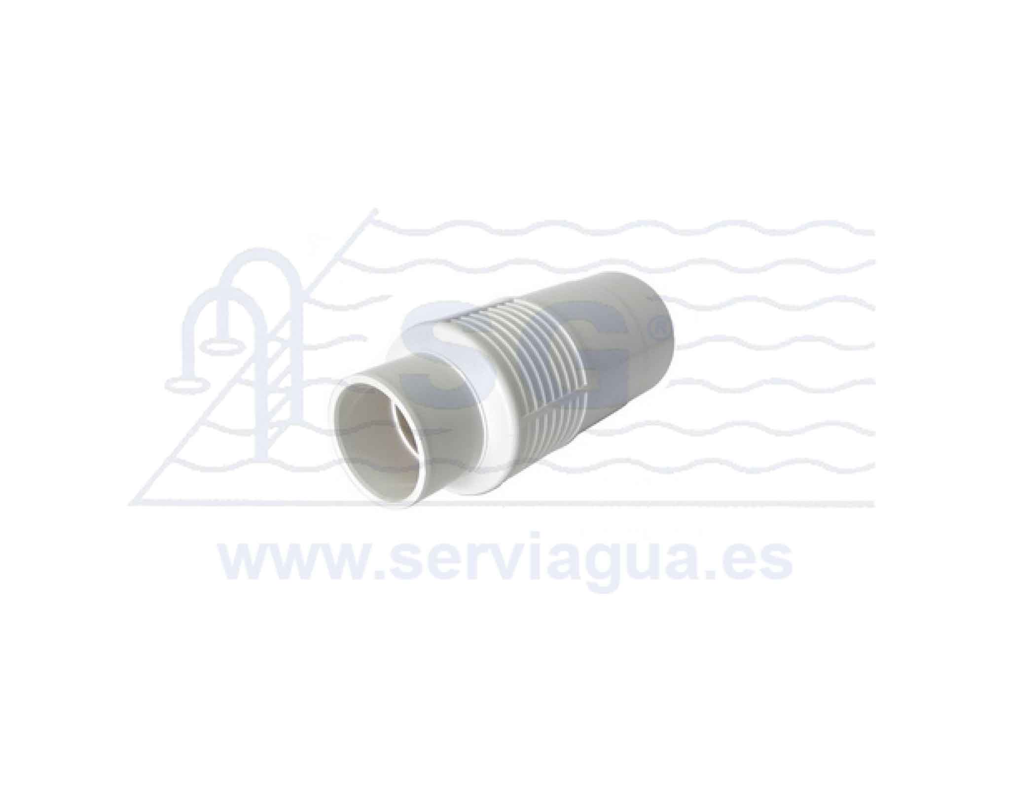 Tubo de material plástico PVC. Zona de corte de 120 mm para poder ajustar a la pared o al fondo de la piscina. Conexión de Ø 63 o Ø 75 mm según preferencias.