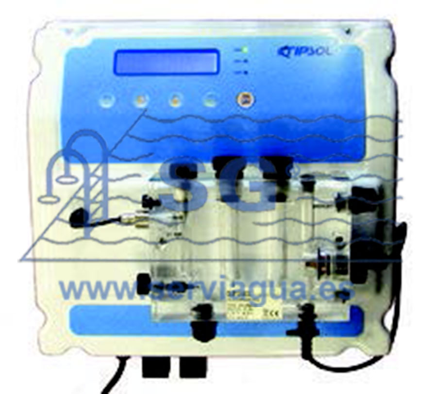 Incluye una unidad de control digital que opera según los ajustes programados, un electrodo de pH con conector BNC y una célula amperométrica de dos electrodos (Cu/Pt) para la medición de cloro residual, ya montada en un portasonda de flujo contínuo con sensor de caudal.