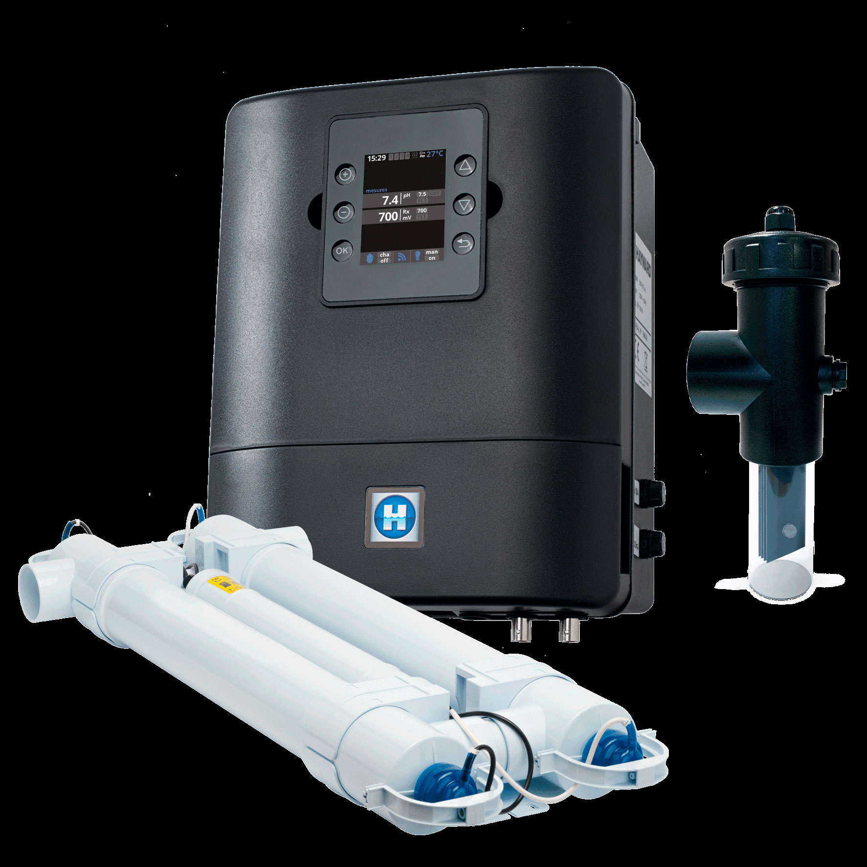 ■ Clorador salino AquaRite UV LS con una combinación innovadora de 3 sistemas de desinfección: tecnología ultravioleta, electrólisis de baja salinidad e hidrólisis (concentración de sal = 1,5 g de sal/l).